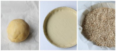 Avendo scelto di utilizzare la cottura in bianco ho bucherellate il fondo con i rebbi di una forchetta per far fuoriuscire l’aria e non far gonfiare l’impasto in forno. Vi ho disposto sopra un foglio di cartaforno e sopra ancora ho coperto con del riso in modo da evitando che si gonfiasse in modo non uniforme.