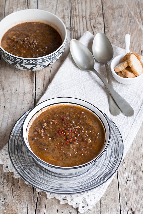 Una minestra di lenticchie cremosa e saporita, un vero e proprio comfort food, se si mettono in ammollo le lenticchie la mattina, la sera bastano al massimo 25-30 minuti per preparare una zuppa di legumi deliziosa.